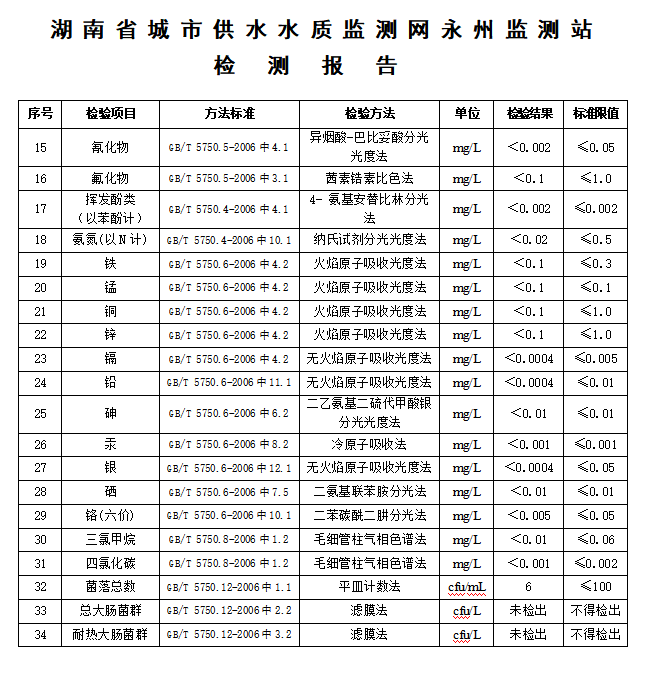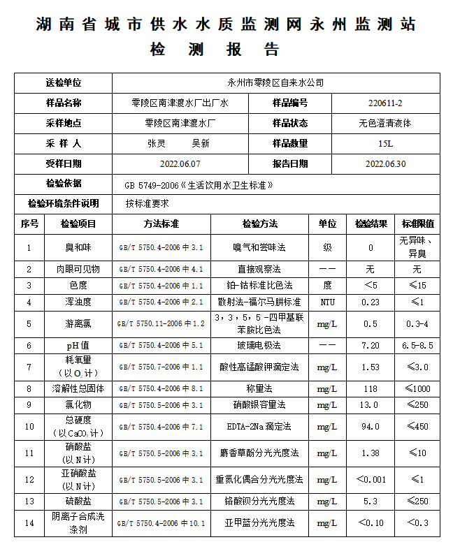 零陵区南津渡水厂2022年6月份出厂水质报告