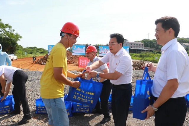 在滨江新城康养综合体项目施工现场,赵立平认真察看项目建设进度,与奋战在一线作业人员亲切交谈,并送上藿香正气水等“夏日清凉大礼包”,对他们不畏酷暑、依然坚持奋战在工作一线的敬业精神给予高度肯定,为零陵经济社会高质量发展作出的积极贡献表示感谢。希望大家坚持质量第一、安全至上,确保工程质量、施工安全和自身安全,打造精品工程、阳光工程、放心工程。同时,他要求企业要关心关爱一线作业人员,科学合理安排作息时间,坚守安全底线,严把施工安全关。